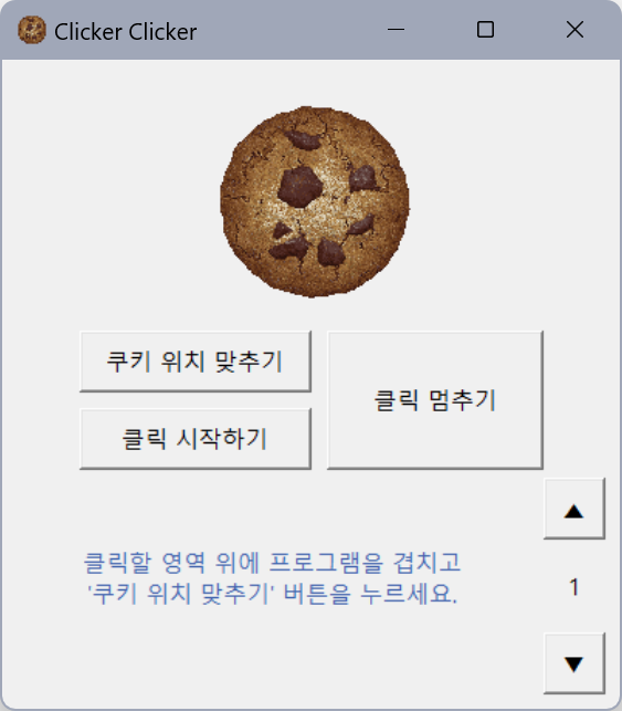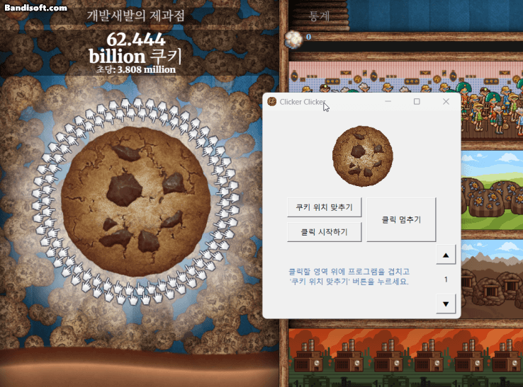 '쿠키 위치 맞추기' 라는 버튼을 직접 클릭할 영역에 맞춰 겹쳐서 눌러 주는 게 포인트임
