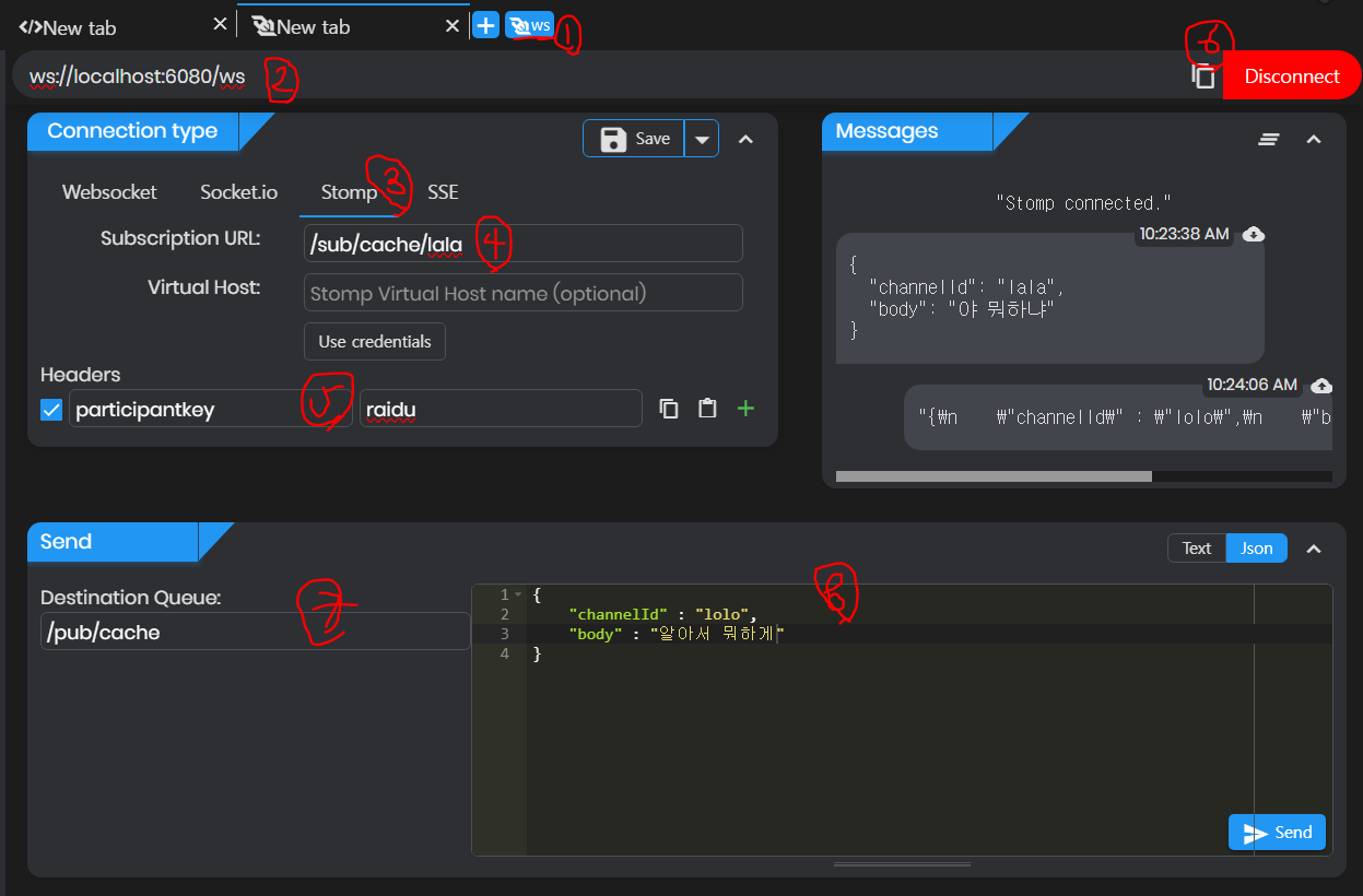 ⑦ : 메시지를 보낼 거라면, Destination Queue 항목에 내가 서버에 지정해 놓은 publish URL을 쓴다. 이때는 채널 이름이나 이런 건 필요 없고 그냥 @MessageMapping으로 지정한 엔드포인트를 퍼블리싱 prefix와 함께 쓰면 된다.