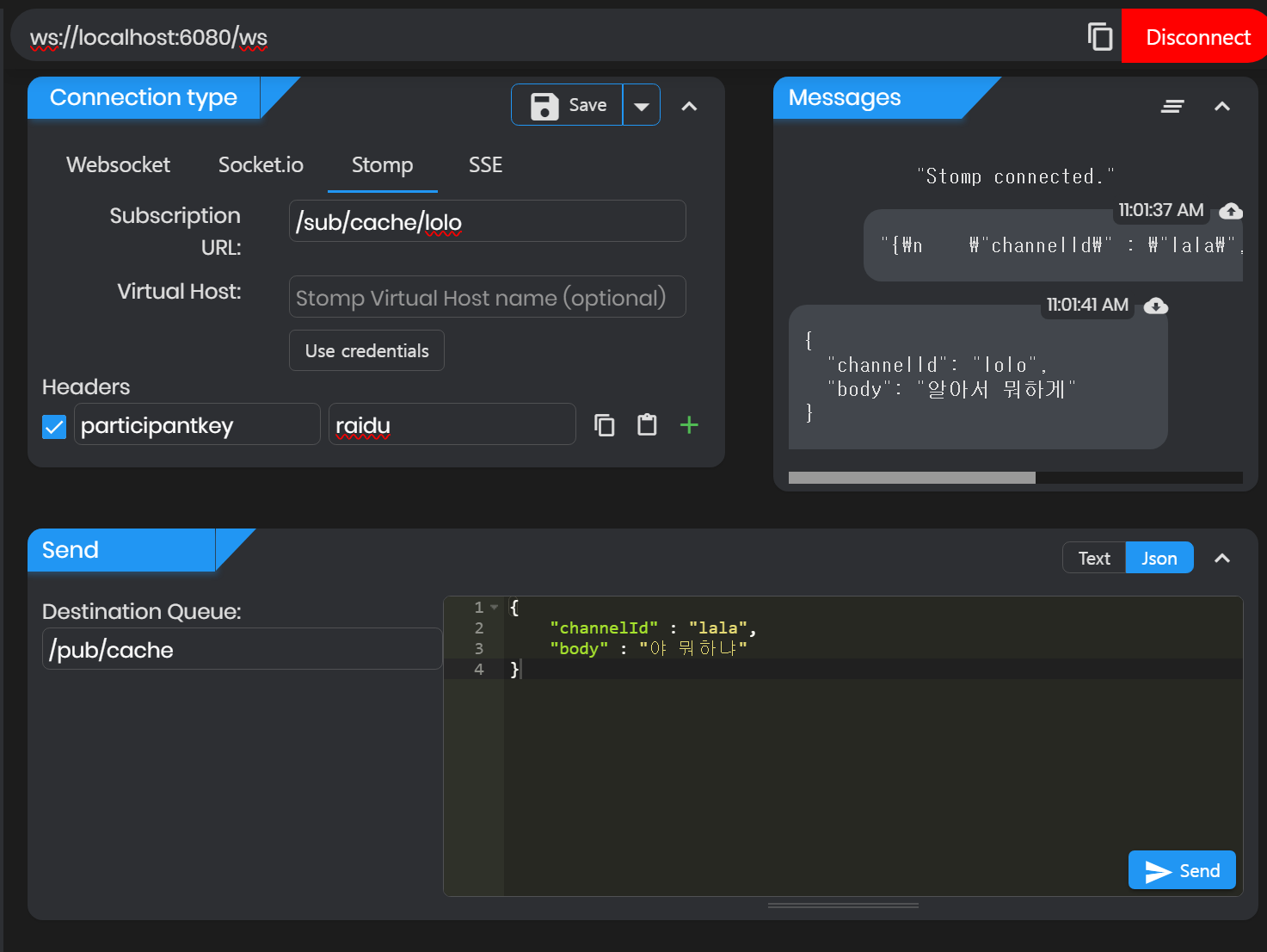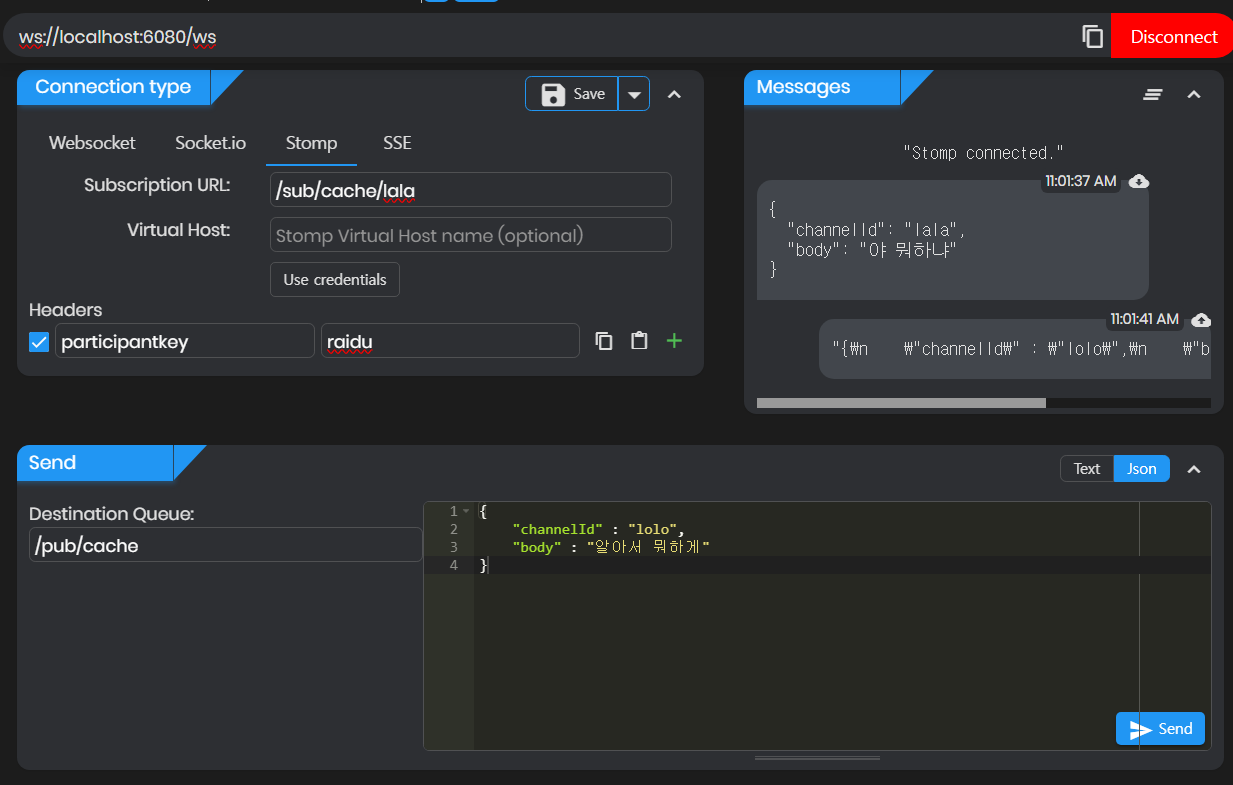 연결에 성공하면 아래 메시지 창에 "Stomp Connected." 가 나타난다.